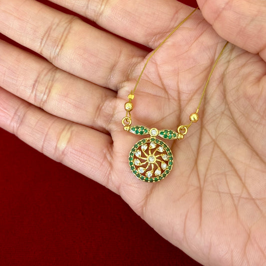 Emerald Green Invisible Chain Pendant Set with Stud Earrings | Gold Finish CZ Floral Round Pendant Necklace | Elegant Minimal Jewelry Set