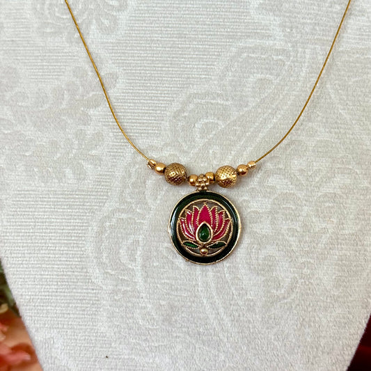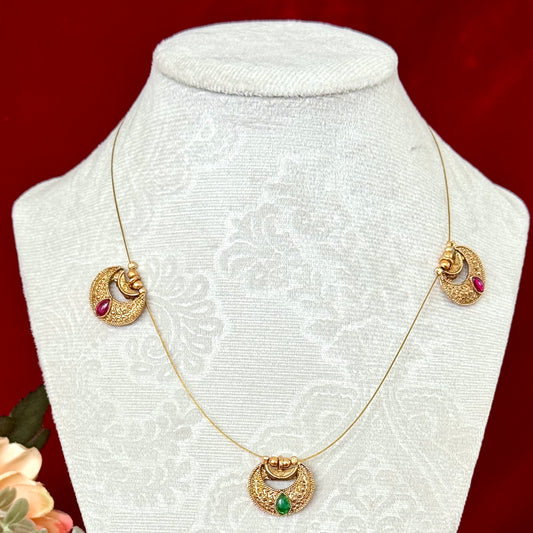 Chandrakor Necklace Set with Invisible Chain, Antique Gold Temple Jewelry, Ruby Green Stone Pendant Set, Minimalist Maharashtrian Jewelry
