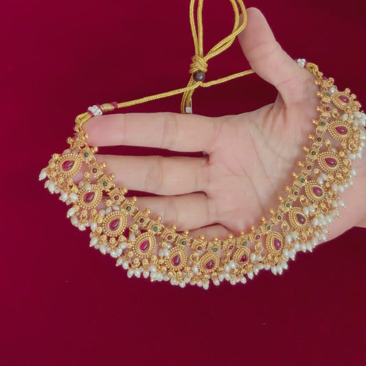 Antique Gold Choker Necklace Set with Ruby Green Stones & Pearl Drops | Temple Jewelry Bridal Choker | South Indian Wedding Necklace