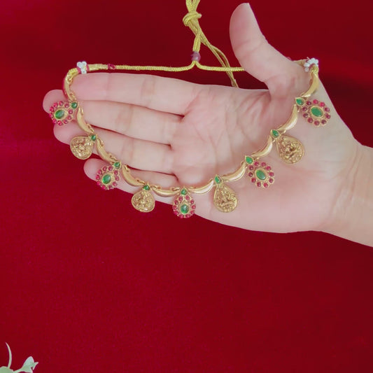 Antique Gold Lakshmi Necklace Set with Red & Green Stones, Temple Jewelry Set, South Indian Bridal Necklace, Traditional Indian Wedding Jewe