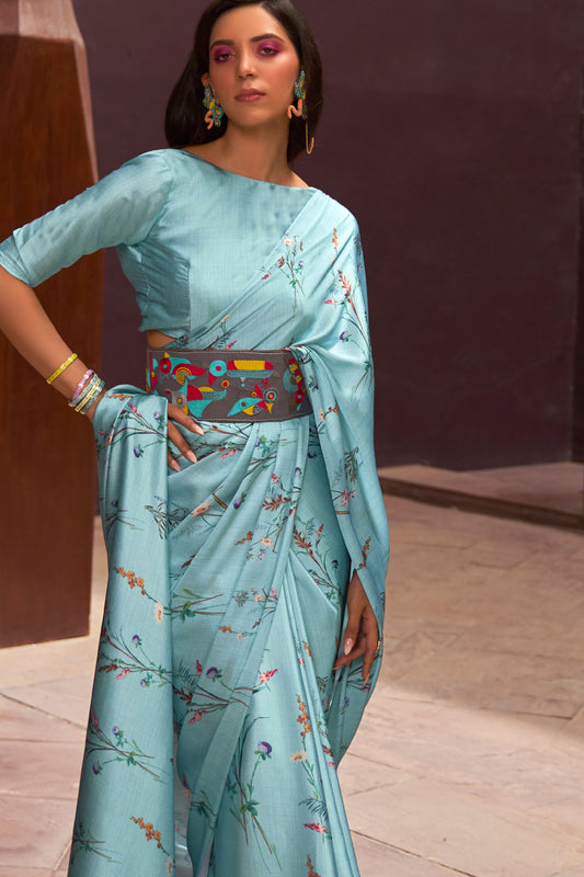 Sky Blue Digital Floral Printed Satin Crepe Saree, Party Wear Saree