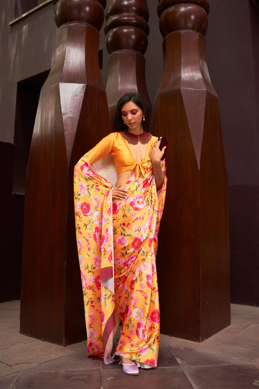 Saffron Mango Digital Floral Printed Satin Crepe Saree, Party Wear Saree