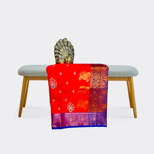 Bright Red With Rich Blue Color Banarasi Satin Silk Saree With Beautiful Embroidery And Stone Work
