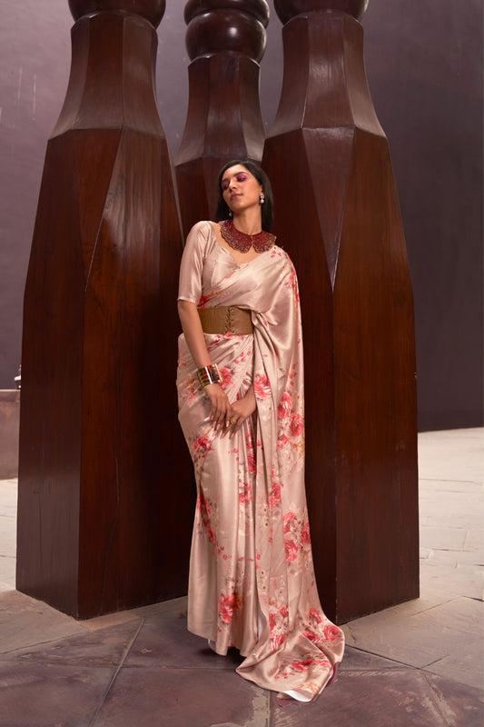 Golden Digital Floral Printed Satin Crepe Saree, Party Wear Saree