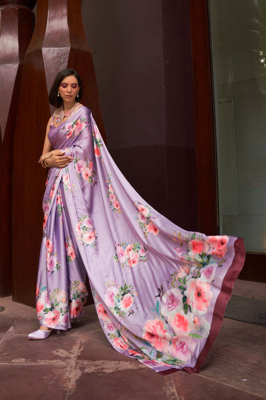 Lavender Digital Floral Printed Satin Crepe Saree, Party Wear Saree