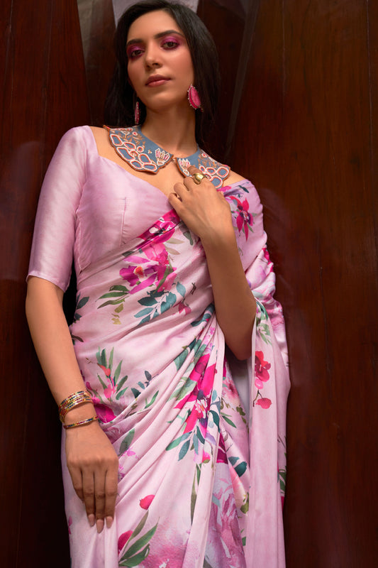 Light Pink Digital Floral Printed Satin Crepe Saree, Party Wear Saree