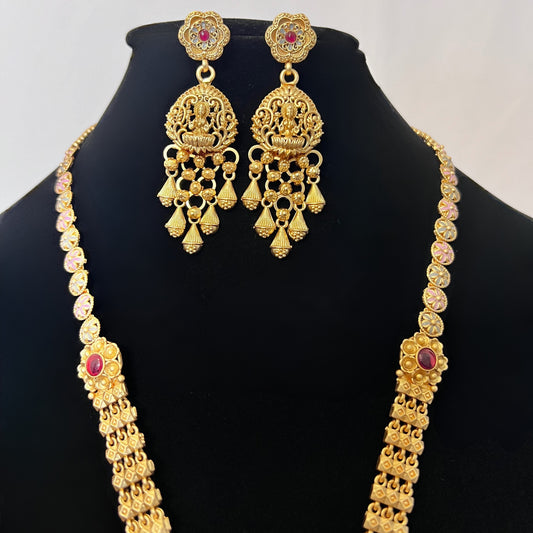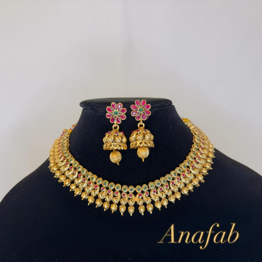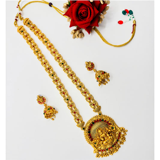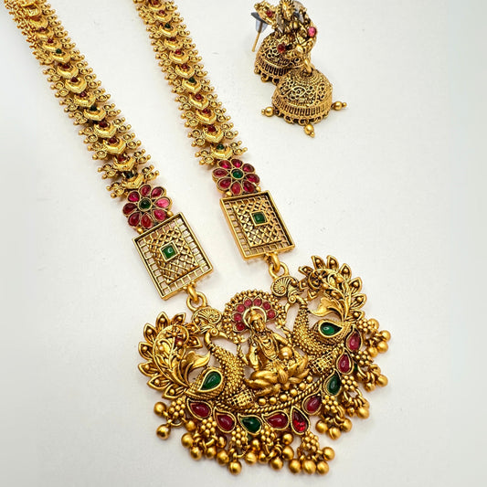 Traditional Lakshmi Temple Necklace Set with Ruby Green Stones & Jhumka Earrings