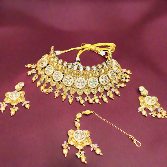 Royal Kundan Meenakari Choker Necklace Set | Antique Gold Bridal Jewelry | Handcrafted Indian Wedding Necklace with Earrings & Maang Tikka