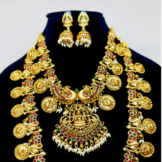Exquisite Temple Jewelry set with Lakshmi motif ( 3 Piece Set), Gold-Plated Traditional Indian Combo Jewelry set Bridal Jewelry Necklace Set with short and long necklace and matching Earrings