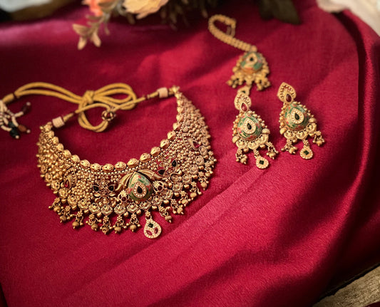 Luxury Antique Gold Temple Choker Necklace Set | Handcrafted Kundan Enamel Bridal Jewelry | Indian Wedding Choker with Earrings & Maang Tikk