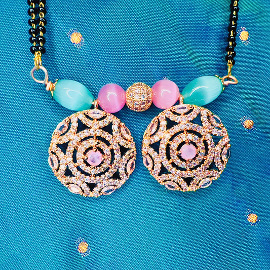 Trendy Gold Plated Ad Stone Diamond Vati Pendant With Long Black Beads Poth/Chain Mangalsutra For Women