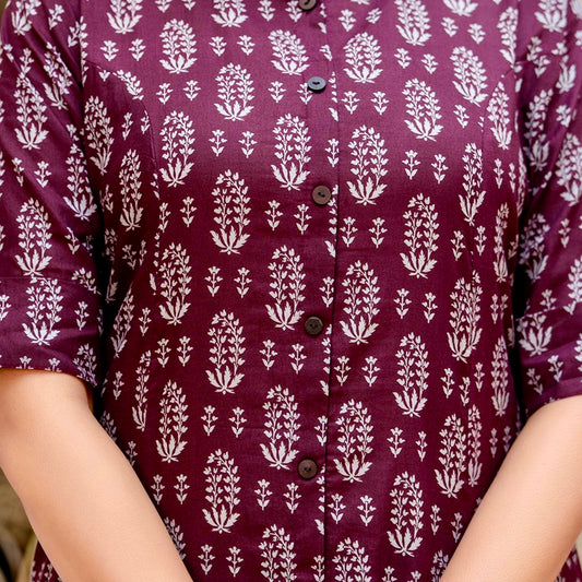 Wine Color Jaipuri Kalamkari Print Aline Kurti With Pant