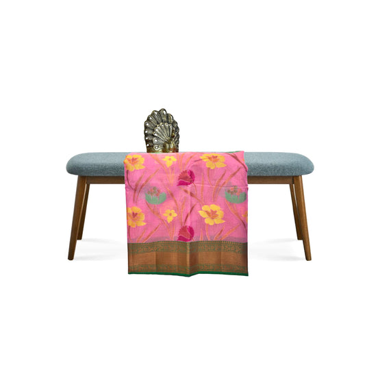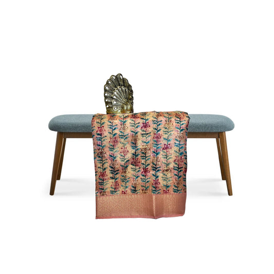 Peach Color Floral Printed Tussar Silk Saree And Zari Woven Design