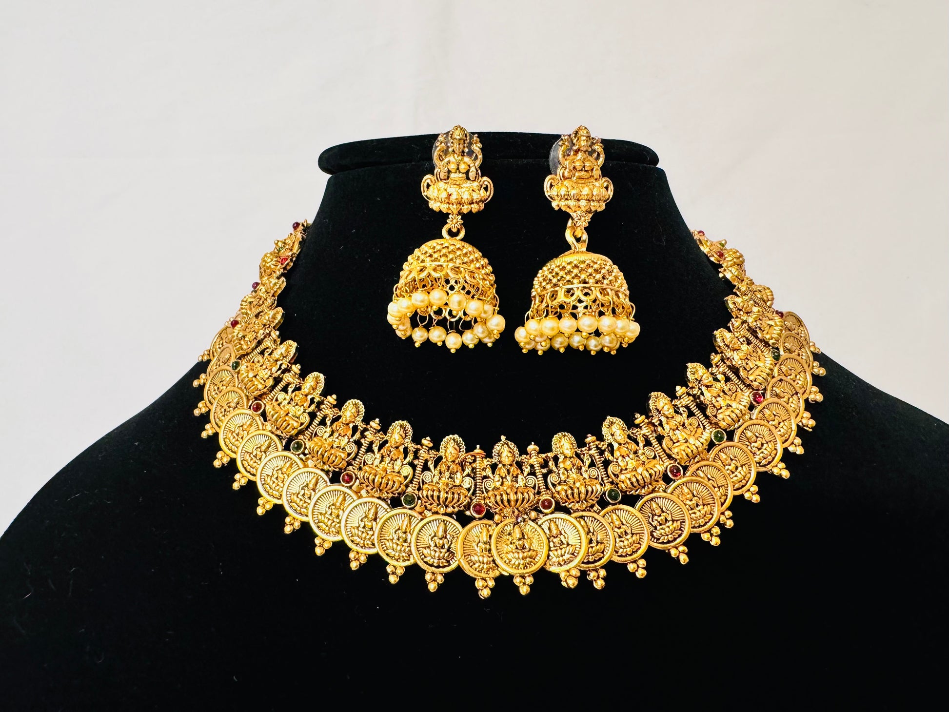 Add a timeless statement to your collection — this Lakshmi coin necklace set blends tradition and elegance beautifully!