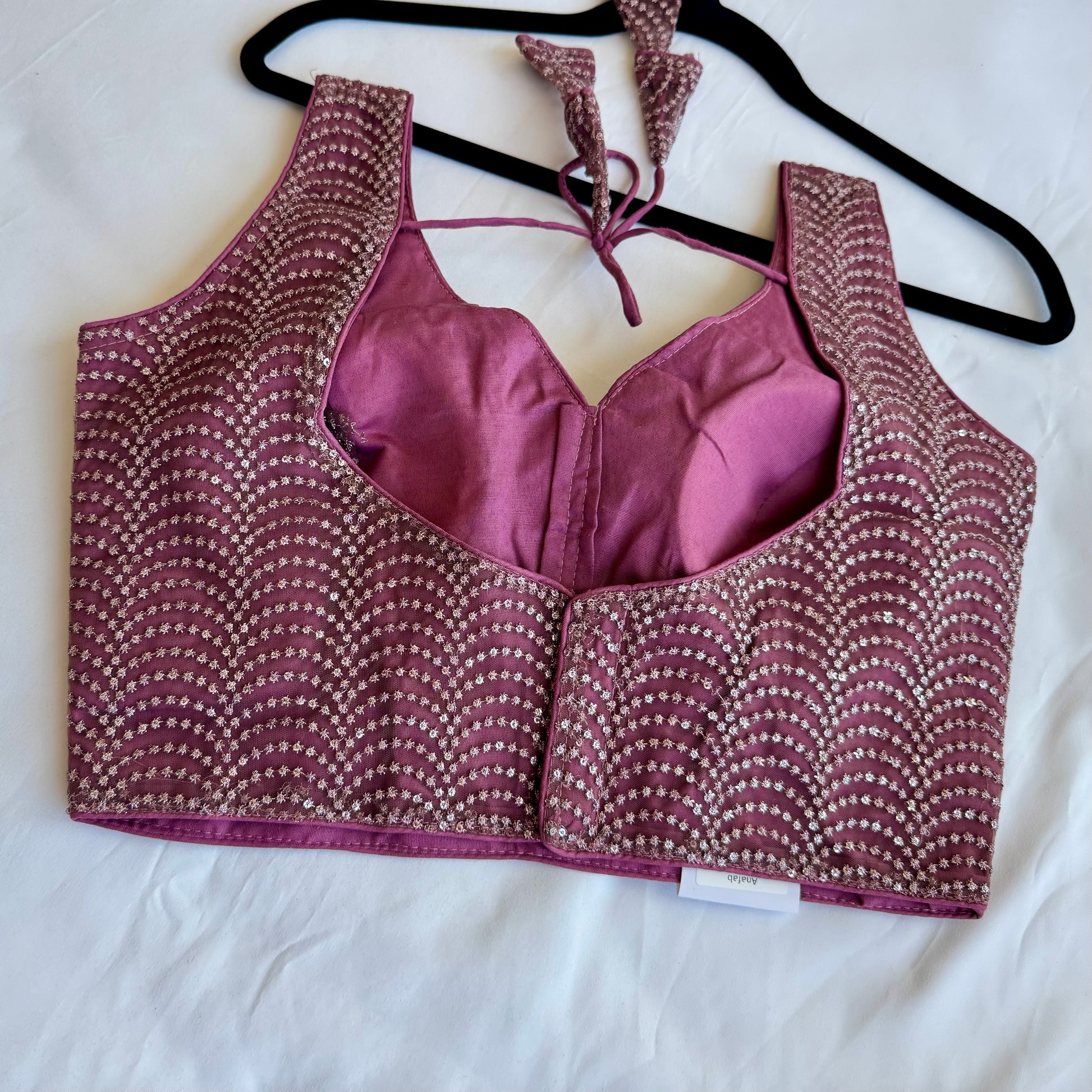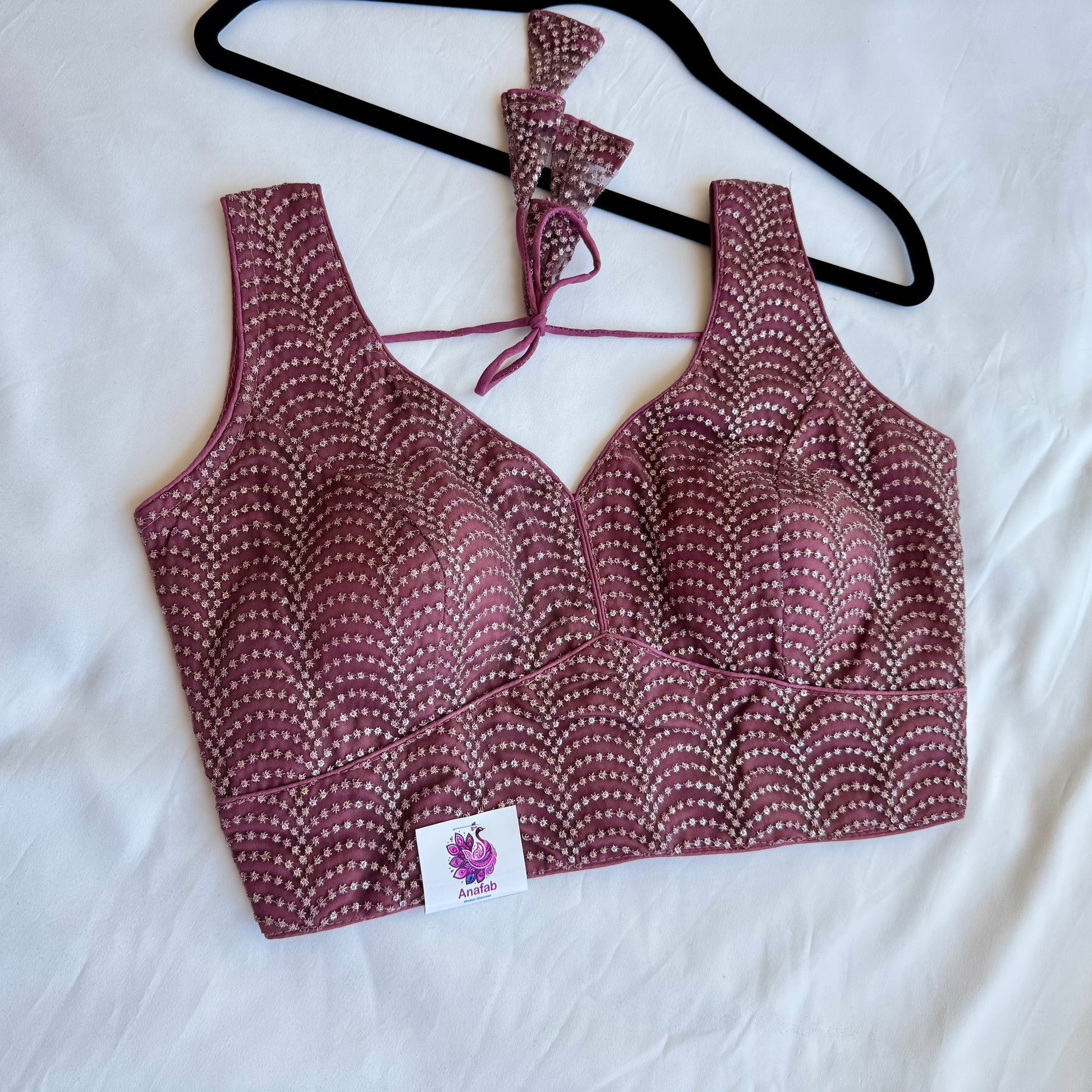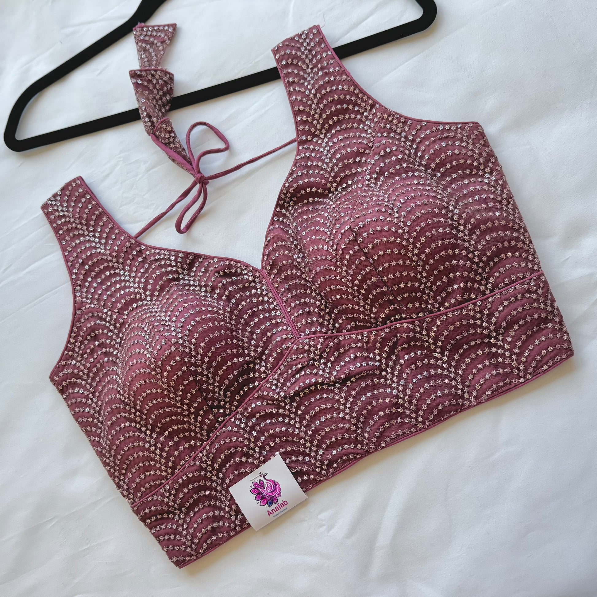 Soft, elegant, and easy to style — this Dark mauve designer blouse is perfect when you want something subtle yet eye-catching. The delicate sequin work is arranged in a graceful pattern that adds just the right amount of shimmer without feeling too heavy.