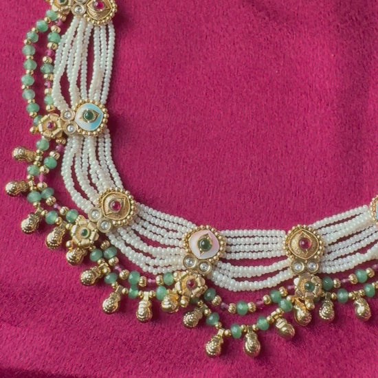 A beautiful traditional necklace set featuring delicate layers of tiny pearls paired with green bead accents and antique gold detailing. The intricate motifs and small dangling charms give the necklace a rich festive look while keeping it elegant and graceful.