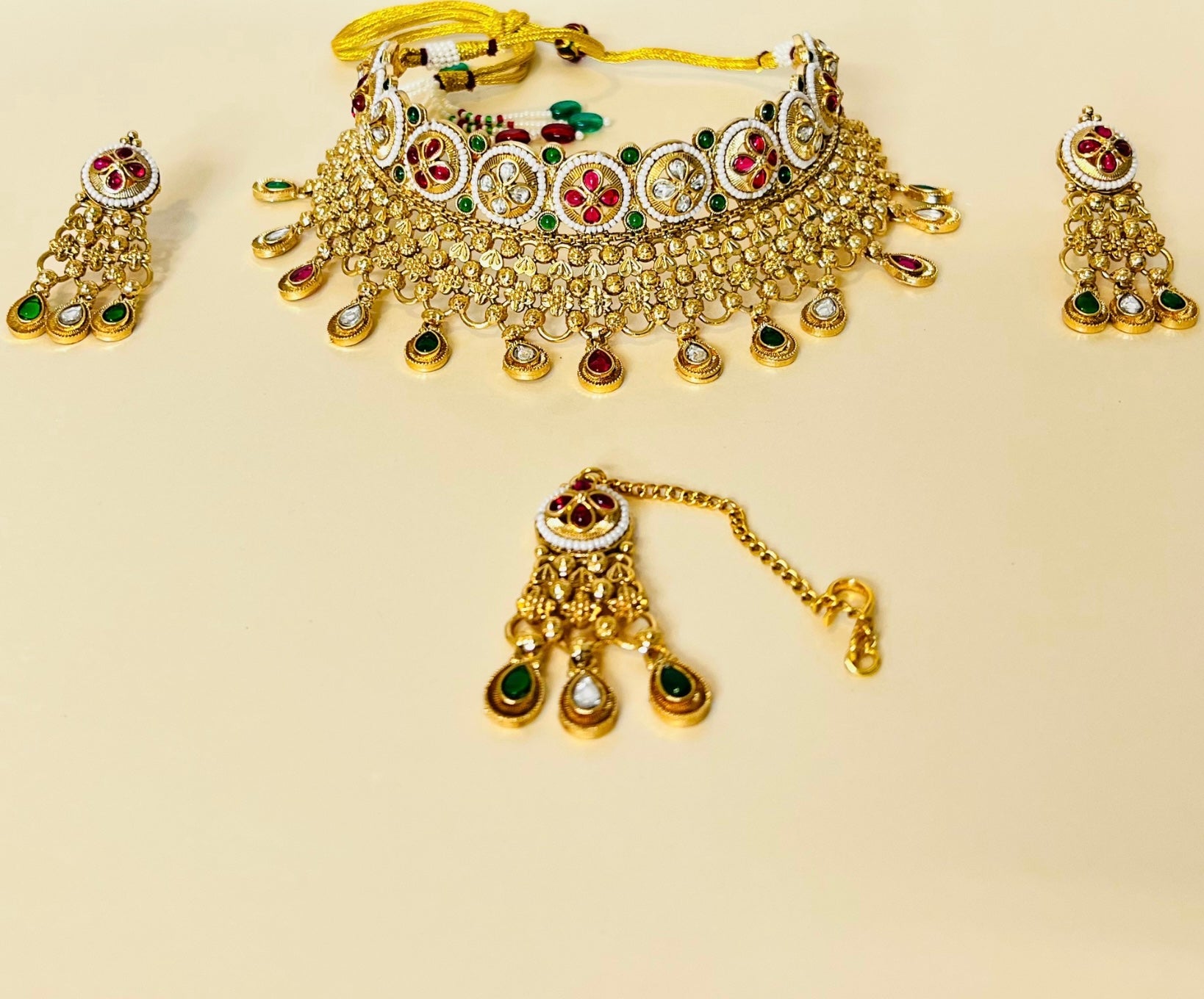 Luxury Kundan Bridal Choker Set | Ruby & Emerald Stone Indian Necklace | Elegant Wedding Jewelry Set with Maang Tikka